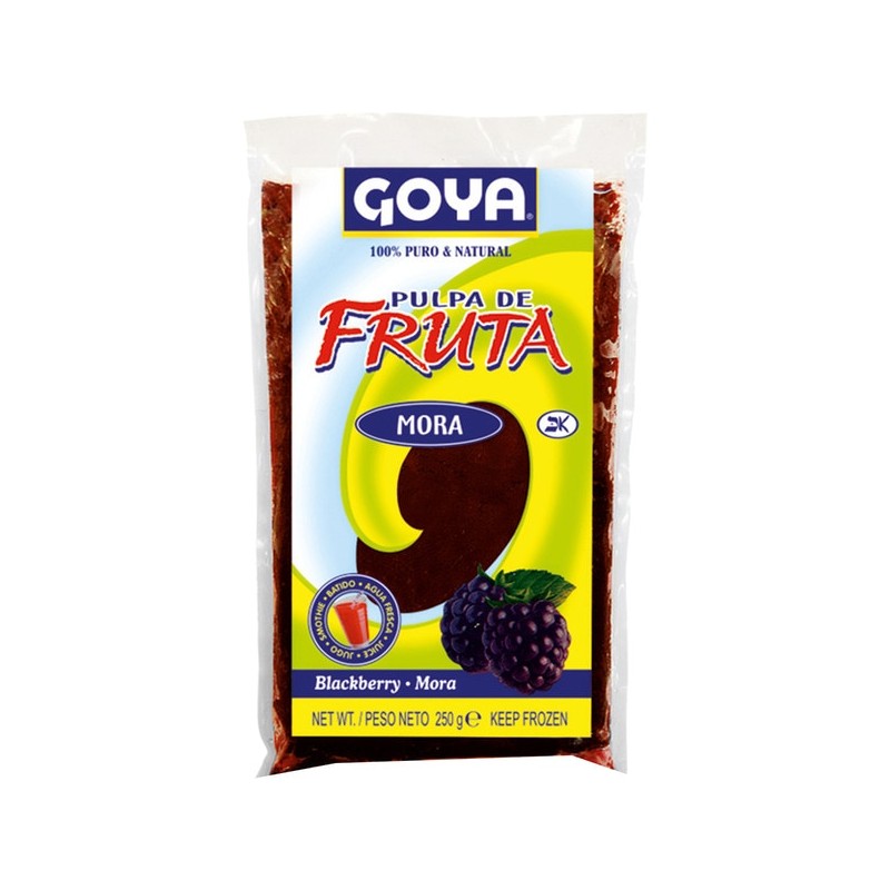 Pulpa de Mora GOYA 250 g, bayas andinas congeladas y molidas. Sin azúcar añadida, sin grasa, sin colesterol y sin gluten. Color morado intenso y sabor dulce-cítrico balanceado. Perfecta para jugos, batidos, mermeladas y postres. Solo descongela y disfruta. ¡Compra online y llévate el sabor de los Andes!