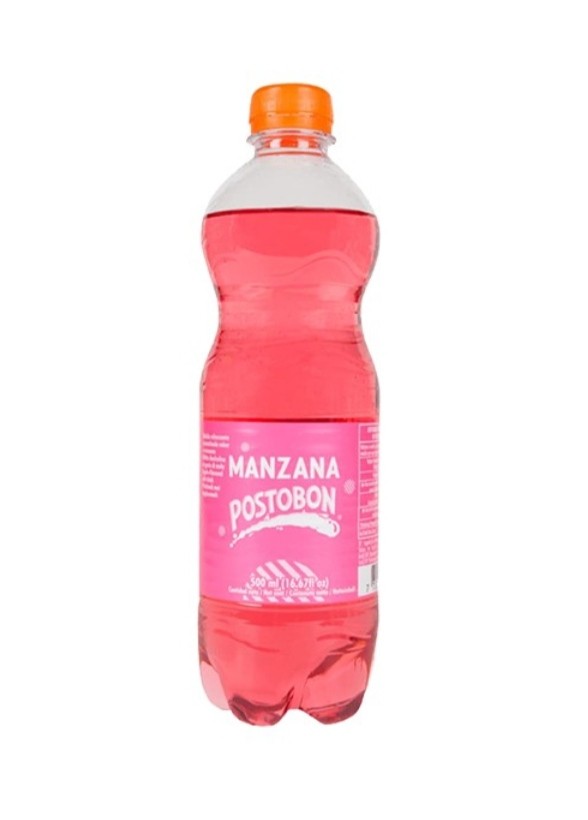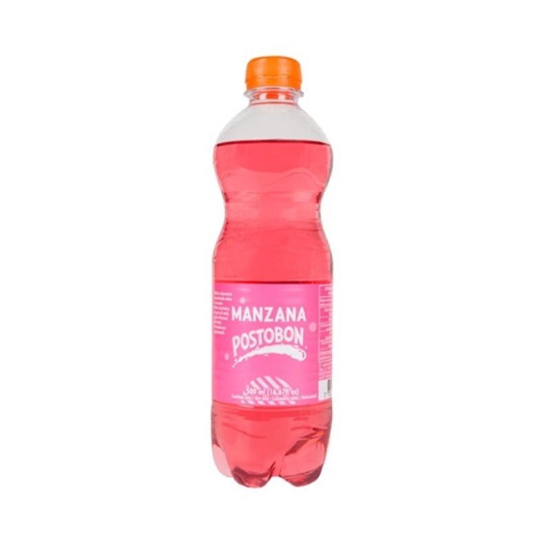 Postobón Manzana 500 ml: refresco carbonatado color rosa intenso con sabor a manzana roja dulce y burbuja suave. Sin grasa ni proteínas, solo 98 kcal por botella. Sirve bien fría y acompaña cualquier comida.